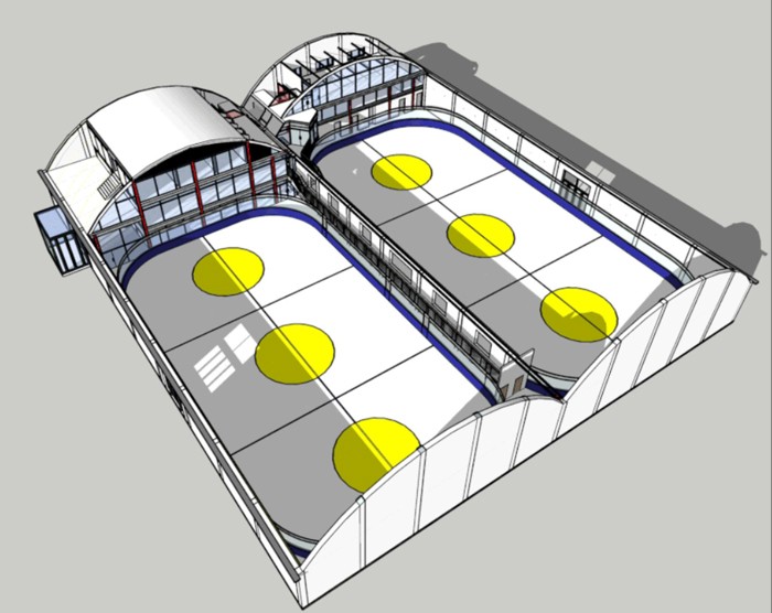 3A冰上空間有兩塊冰場,大尺寸一點(diǎn)的是冰球場,小尺寸一點(diǎn)的是花滑場。