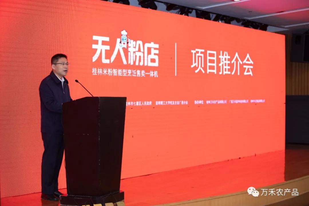 11月29日,“無人粉店—桂林米粉智能型烹飪售賣一體機項目推介會”在桂林國際會展中心舉行。這一活動由桂林國家高新區管委會、桂林市七星區政府和昆明理工大學廣西校友會共同舉辦。桂林市政府副市長樊新鴻、昆明理工大學副校長牛治亮、桂林市政協副主席鄭毅等領導出席活動現場。