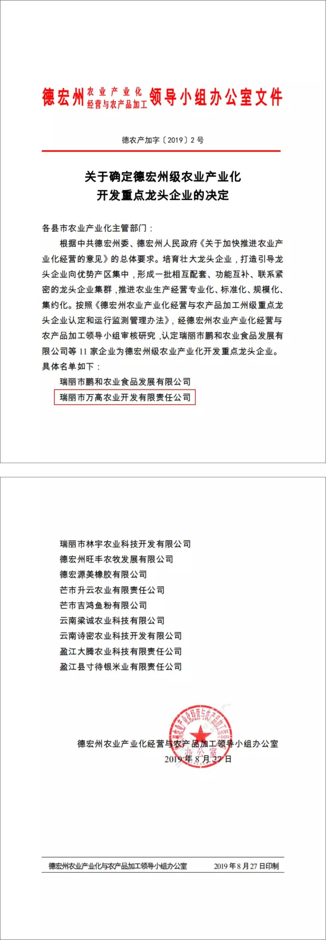 2019年8月27日,經德宏州農業產業化經營與農產品加工領導小組審核研究,認定瑞麗市萬高農業開發有限責任公司為德宏州級農業產業化開發重點龍頭企業。