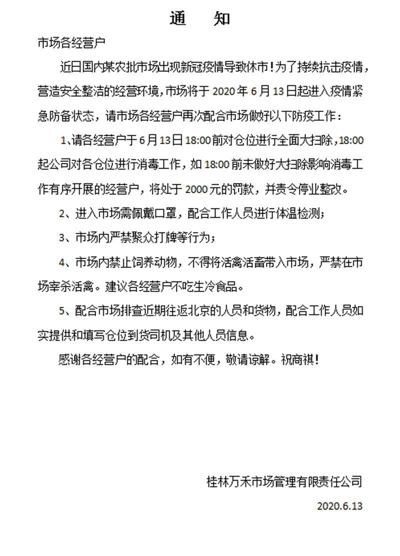近日,國內(nèi)某農(nóng)批市場出現(xiàn)新冠疫情導(dǎo)致休市。為了持續(xù)抗擊疫情,營造安全整潔的經(jīng)營環(huán)境,萬禾市場迅速行動,召開緊急防疫工作布置會議。于2020年6月13日發(fā)布緊急通知,宣布入疫情緊急防備狀態(tài),并對市場倉位進行全面消殺,排查進出車輛及貨物等多項針對性的措施,堅決遏制疫情的蔓延勢頭。