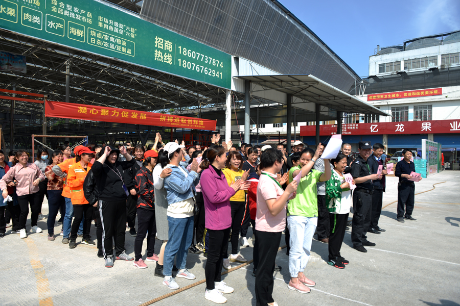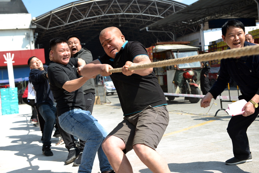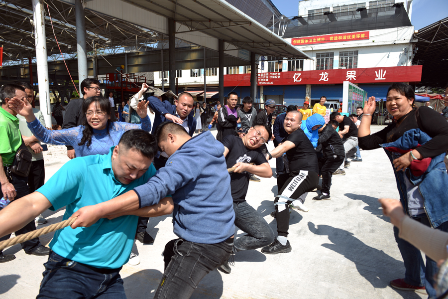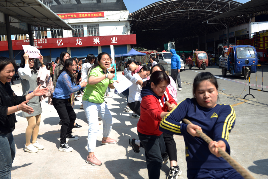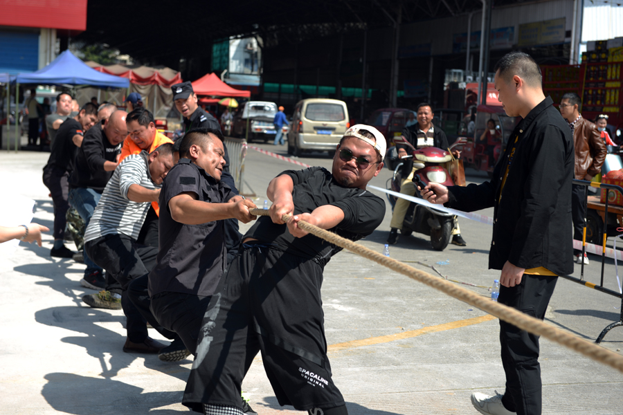 參賽隊員們排好隊列、擺正姿勢,雙手緊握繩子......隨著一聲哨響,一場拔河比賽緊張開鑼,大繩被拉得緊緊繃繃,各組隊員們全力以赴、咬牙堅持,“加油”的聲音響徹市場,一旁的啦啦隊亦是全情投入,感受著運動帶來的快樂。