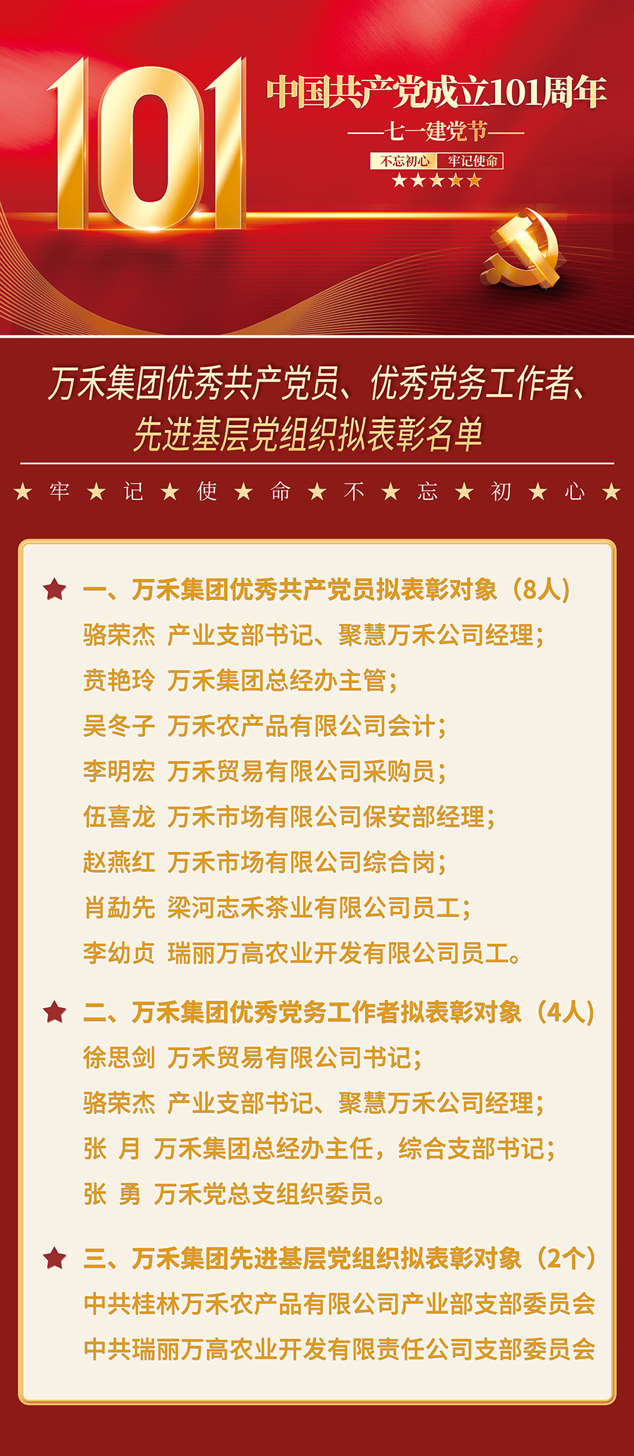 今年是中國共產黨成立101周年。黨總支決定,表彰一批公司優秀共產黨員、優秀黨務工作者和先進基層黨組織。根據評選表彰工作部署,在公司各支部提出推薦對象的基礎上,經認真審核、遴選審議,確定了駱榮杰等8名同志為公司優秀共產黨員、徐思劍等4名同志為公司優秀黨務工作者、中共桂林萬禾農產品有限公司產業部支部委員會2個基層黨組織為公司先進基層黨組織擬表彰對象。