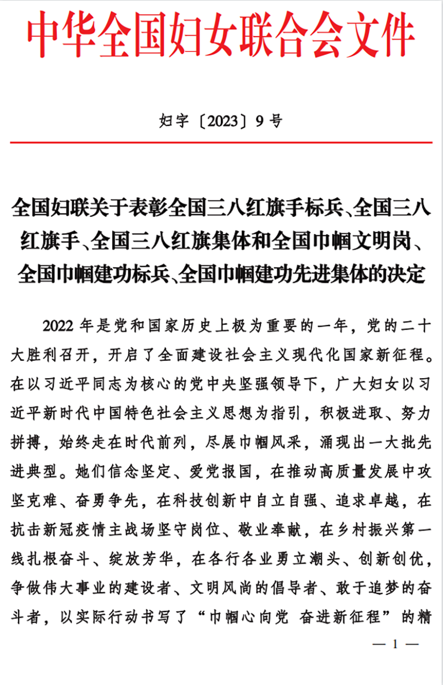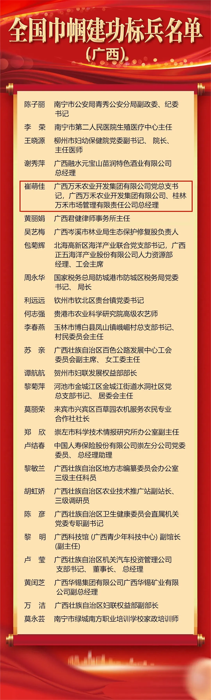 2月25日,全國(guó)婦聯(lián)印發(fā)《關(guān)于表彰全國(guó)三八紅旗手標(biāo)兵、全國(guó)三八紅旗手、全國(guó)三八紅旗集體和全國(guó)巾幗文明崗、全國(guó)巾幗建功標(biāo)兵、全國(guó)巾幗建功先進(jìn)集體的決定》,廣西萬禾農(nóng)業(yè)開發(fā)集團(tuán)有限公司黨總支書記,廣西萬禾農(nóng)業(yè)開發(fā)集團(tuán)有限公司、 桂林萬禾市場(chǎng)管理有限責(zé)任公司總經(jīng)理崔萌佳獲授“全國(guó)巾幗建功標(biāo)兵”稱號(hào)。