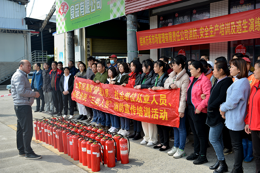 為增強(qiáng)黨員干部及市場(chǎng)經(jīng)營(yíng)戶消防安全意識(shí),有效掌握防火、滅火應(yīng)急處置能力,4月25日,萬(wàn)禾集團(tuán)五里店市場(chǎng)支部組織黨員干部及市場(chǎng)經(jīng)營(yíng)戶在五里店果蔬批發(fā)市場(chǎng)開(kāi)展“增強(qiáng)消防意識(shí),筑牢安全防線”主題黨日活動(dòng),桂林市七星消防隊(duì)?wèi)?yīng)邀到場(chǎng)進(jìn)行消防安全培訓(xùn)。